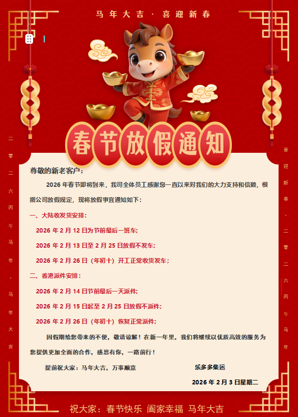尊敬的新老客户: 2026年春节即将到来,我司全体员工感谢您一直以来对我们的大力支持和信赖,根据公司放假规定,现将放假事宜通知如下: 一、大陆收发货安排: 2026年2月12日为节前最后一班车; 2026年2月13日至2月25日放假不发车; 2026年2月26日(年初十)开工正常收货发车; 二、香港派件安排: 2026年2月14日节前最后一天派件; 2026年2月15日起至2月25日放假不派件; 2026年2月26日(年初十)恢复正常派件; 因假期给您带来的不便,敬请谅解!在新一年里,我们将继续以优质高效的服务为您提供更加全面的合作,感恩有你,一路前行! 提前祝大家:马年大吉!万事顺意!...